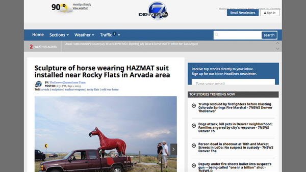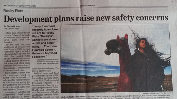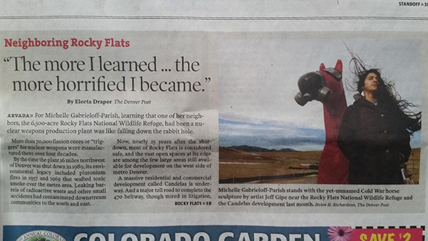 Sculpture of horse wearing a HAZMAT suit installed near Rocky Flats in Arvada area